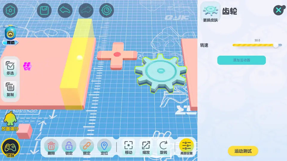 【机关组件】拥有独立参数面板,不同机关可调节不同属性:齿轮能调转速,弹簧可设弹力,传送带能控方向与速度……参数越精细,机关行为越可控,创意表达越自由。