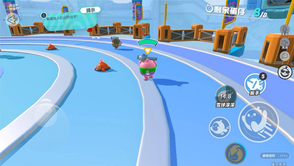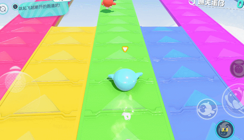 除了基础跑跳扑,掌握“滚蛋”技能是进阶关键——激活后化身高速弹球,兼具位移快、可二段跳、穿行窄道三大优势。但反弹力强、转向迟滞,建议在开阔直道、平稳传送带或无遮挡机关区释放,避免撞墙自扰。