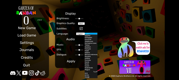班班幼儿园第0章手机免费版是一款全新推出的恐怖探索解谜游戏,英文原名为Garten of Banban 0,为《班班幼儿园》系列的第八部正统续作,游戏继承了该系列标志性的阴森氛围与高难度逻辑解谜机制,全面支持中文、英文、西班牙语、日语等多语言界面,同时内置大量可交互道具及富有挑战性的烧脑谜题,等待玩家逐一破解。