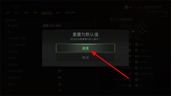 4、当弹出重置为默认值的确认弹窗时,点击弹窗中的重置按钮,就能把手柄按键恢复到默认布局。