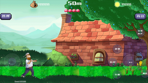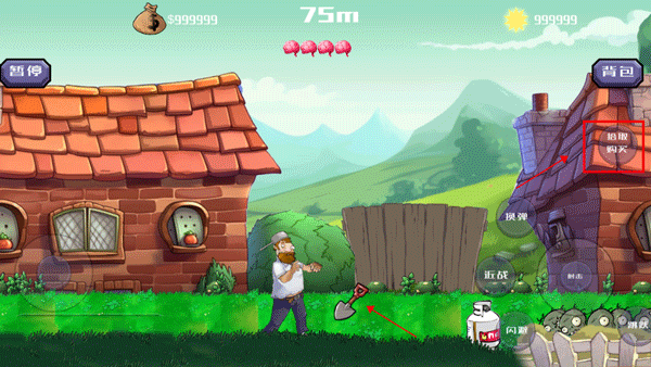 2、屏幕左下方虚拟摇杆控制戴夫自由走位;右侧功能区集成四大核心指令:侧滑闪避、原地跃击、近战格斗键(长按蓄力)、以及自动瞄准射击系统——不同僵尸需匹配不同应对节奏。