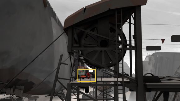 6、下车步行穿越断桥,抵达对岸后,将场景中的金属油桶精准移至箭头所指平台,随后激活控制开关即可完成联动。