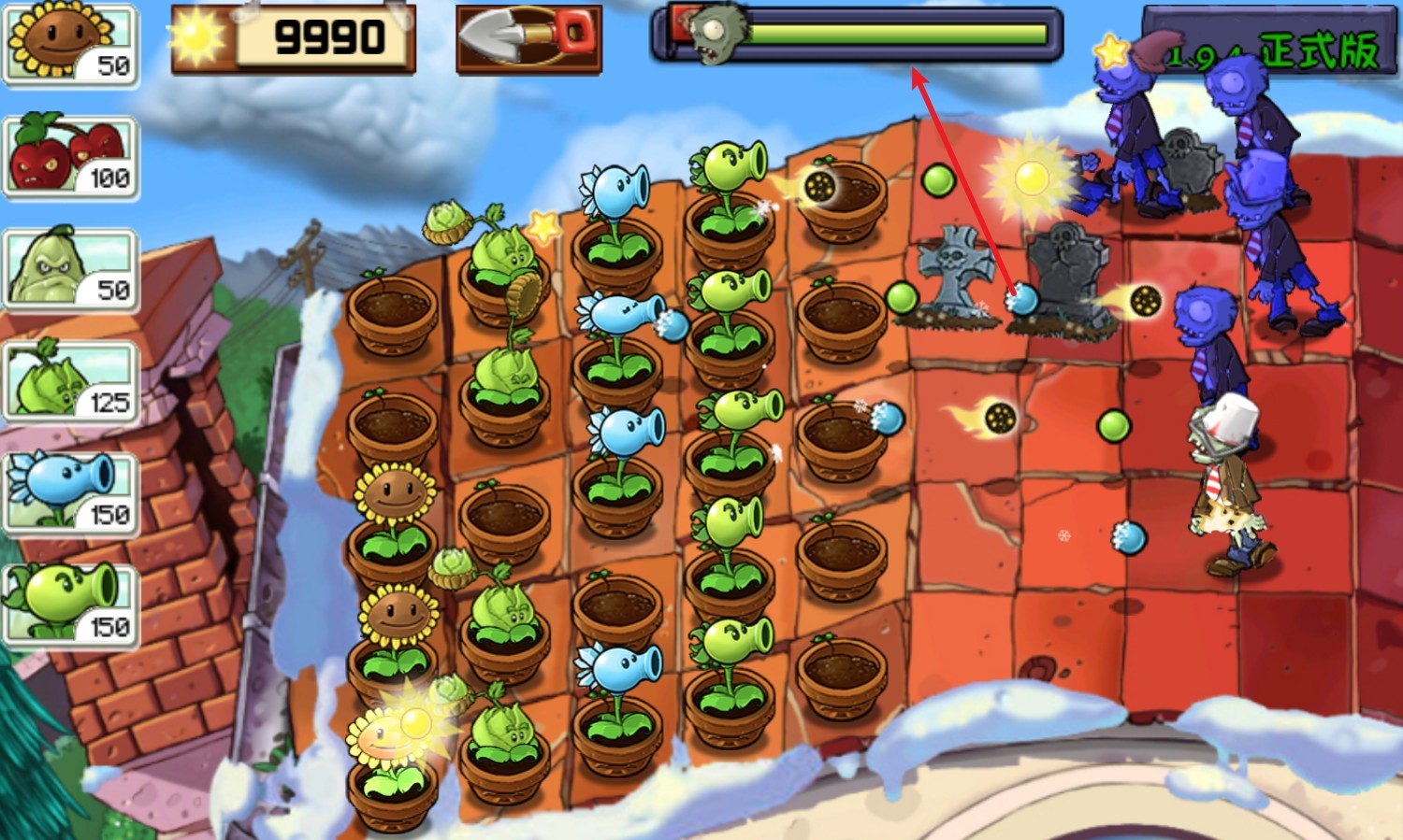 5、当进度条满格并闪烁红光时,即触发“终极大波”,此时需激活储备植物与道具全力防守。