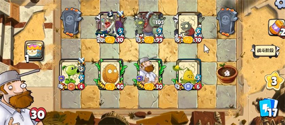 2、起手若抽中三重射手,建议优先部署于中央花盆,作为中轴输出核心;后续可通过阳光管理持续为其叠加攻击增益,并搭配护盾类植物保障其生存周期;