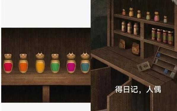 6、翻动台历至“霜降”页,掉落夹层画片;轻触红漆柜门,触发机关弹出一尊闭目人偶日记本。