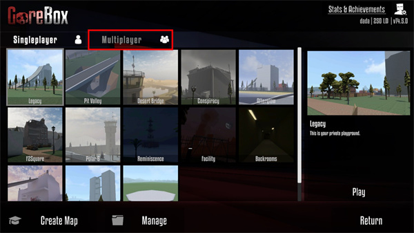 2、进入地图选择页后,顶部菜单栏切换至“Multiplayer(多人游戏)”模式;