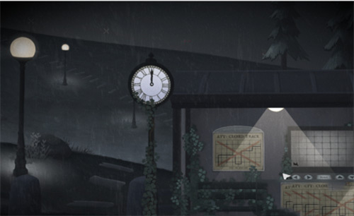 场景:车站 要素:走时不准的挂钟、灰白路线图、带旋钮的调度台