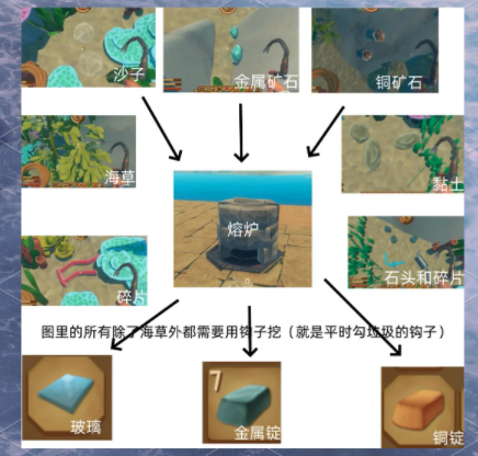 4、海底资源:海里可以获取的物资包括碎片(不可炼制)、金属矿石(可炼制成金属锭)、黏土(不可炼制)和沙子(可炼制成玻璃)。海草可以炼制成葡萄藤粘性物。前期资源紧缺,建议多挖一些。下水前最好先解决鲨鱼,防止被咬。
