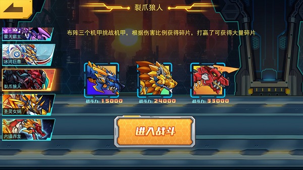 进入主界面后,点击【每日副本】→【机甲征召战】,在可选目标中锁定「烈爪狼王」作为挑战对象。需配置三台已拥有机甲组成编队参战,系统将依据总伤害占比判定胜负,并按比例发放碎片奖励。