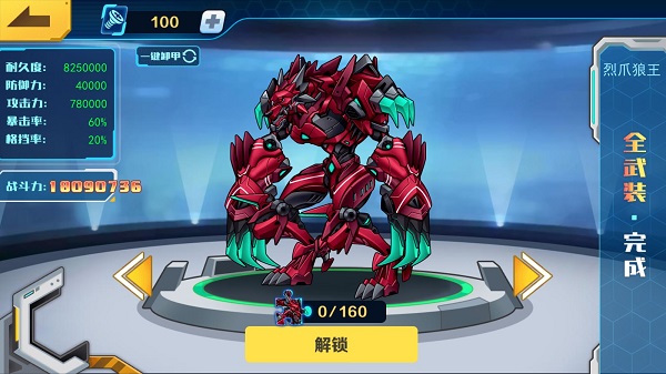 本次版本重磅登场的顶级机甲名为「烈爪狼王」,并非传统命名中的“烈焰狼王”,而是以灼热利爪与爆发性机动著称的新世代战力标杆。该机甲已在机甲仓库「整备中心」正式上线,初始综合战力突破1800万大关,其耐久韧性、装甲抗性、输出阈值及暴击触发机制,均刷新当前机甲性能天花板。