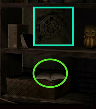 进入院落后,点选右下角雕花木匣,依匣盖浮雕所示顺序点击对应图案,开启后取得半张烧焦符纸。