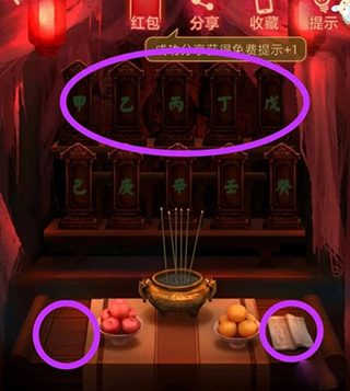 游戏初始身处右侧小祠堂,细察供桌古籍内页插图与文字批注,结合石碑残刻的方位符号,推演出牌位供奉次序,从而激活暗格机关。