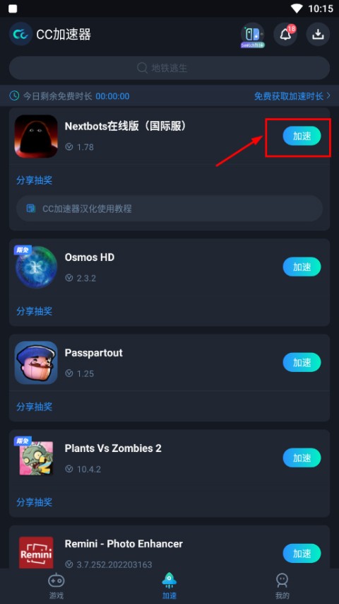 1、提前安装并登录网络优化工具(如CC加速器),搜索「Nextbots联机版」,点击右侧「加速」按钮;