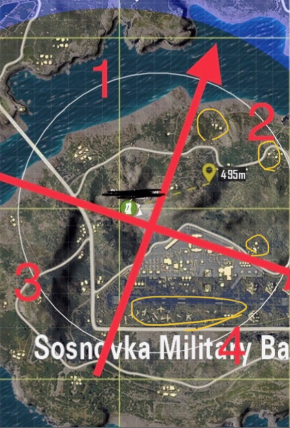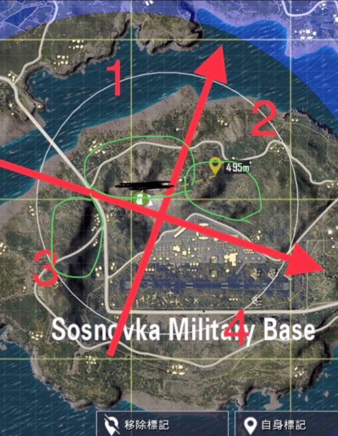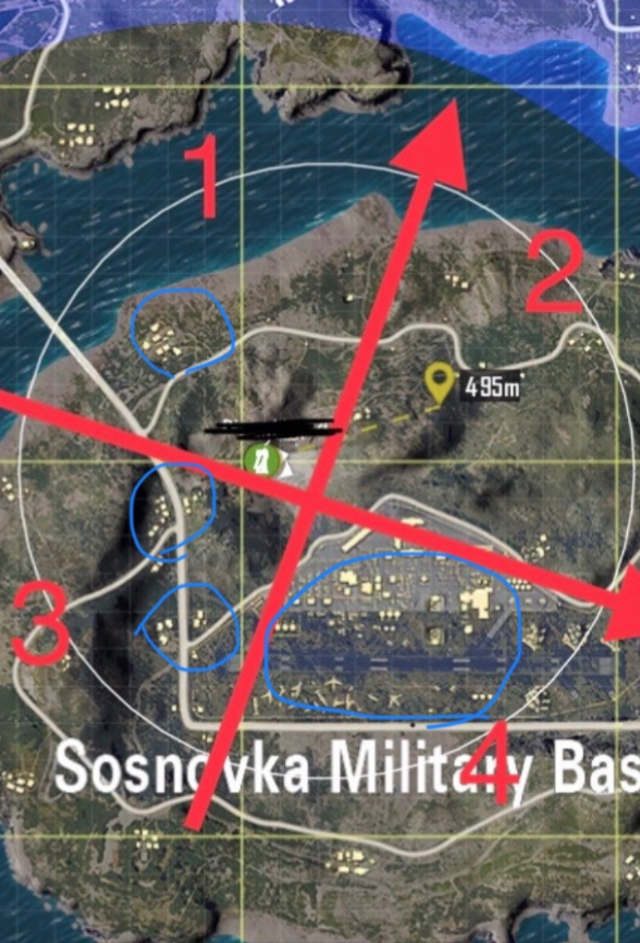 但该点位可通过第四象限的建筑物逐步靠近圈心,提升生存概率。