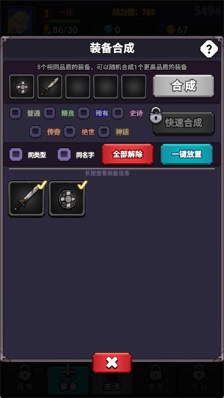 集齐5件同品质装备可进行升阶;同类装备数量越多,合成时获得相同类型装备的概率越高。