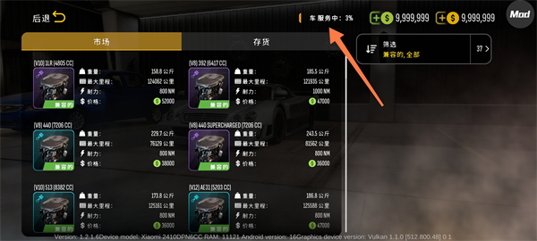 8、返回设置界面,点击【+】购买发动机的机械增压组件,流程与更换发动机相同。