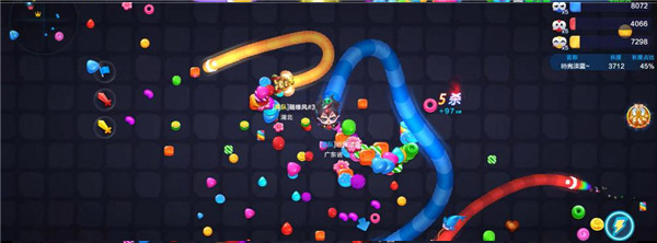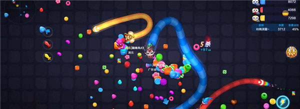 1、发育期:开局前一分钟,所有蛇都较短,击杀收益低且加速消耗大,难以形成有效压制。此时应优先专注发育,集中吞食发光的冰淇淋块,快速提升长度才是关键!