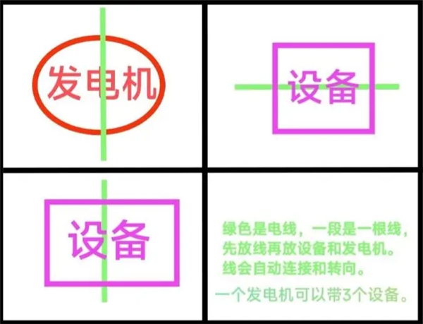 绿色是电线,一段是一根线先放线再放设备和发电机。线会自动连接和转向。