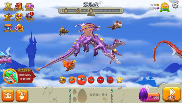 2、进入领土探索界面,即可根据任务要求选龙、皮肤和宠物,可参与的龙尺寸有: “迷你” 、“小”、“中”、“大”、“巨大”、“超大”