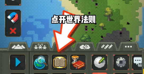 8、进入“世界法则”界面,点击左下角紫色图标,再快速双击中间的眼睛图案,即可解锁全部生物;