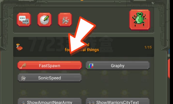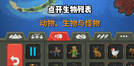 4、点击绿色蜘蛛图标,开启首个选项,进入生物列表,选择“精灵”并暂停游戏;