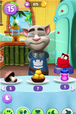 点击这个按键会带汤姆猫到餐厅,桌子上摆着的东西,玩家可以喂给我们汤姆哦。