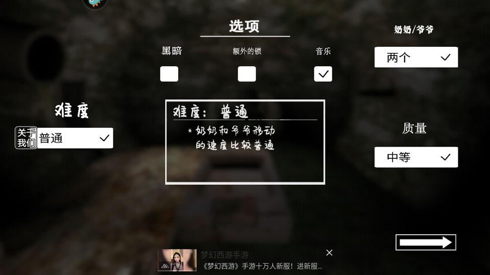 2、进入设置界面后,可自定义游戏难度、画质,并选择是否同时面对奶奶与爷爷,或仅遭遇其中一位。