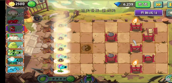 5、如果看到僵尸吞噬了植物,及时用新的植物进行补种,另外可以利用下方的超级豌豆释放大招,造成大范围伤害。