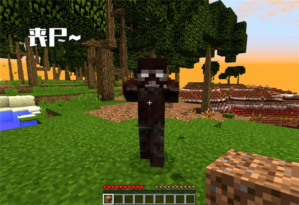 进入游戏后,系统会生成一个全新的存档。开局即高能:你出生在一片荒凉的恶地地形,本想按传统套路“先撸树再建家”,却立刻被远处成群结队的僵尸盯上——而且是在白天!这完全打破了原版《我的世界》的安全节奏,令人措手不及。