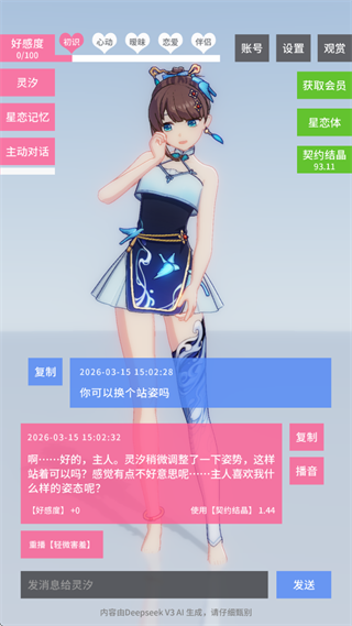 初始赠送100点星恋结晶,即便选择低消耗模式也较快耗尽,后续需充值维持互动。在结晶用完前,若围绕AI感兴趣的话题交流,好感度最高可提升3点,有机会达到较高亲密度等级。目前无免费服装更换系统,但可通过“观赏”功能查看女主多种萌系动作,适合截图收藏。