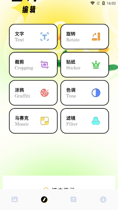2.点击像铅笔一样的图标,里面就有大量的修图工具可使用,有色调,文字涂鸦,贴纸等