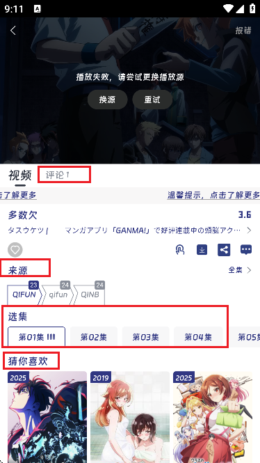 5、选择一步作品点击进入到详情页,可以查看懂啊作品播放来源,选集,评分评论,还会猜你喜欢,为你推荐你可能感兴趣的内容。