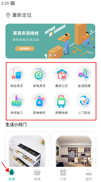 1、打开全民维修联盟app,点击底部“发单”按钮,在服务分类中选择所需项目(例如“家庭保洁”)。
