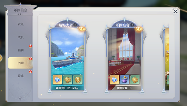 持有宴会券的军团成员可以组织宴会,招待其他成员。举办者和参与者都能获得丰厚奖励。宴会期间会触发红包雨活动,参与的成员可通过抢 红包获得蓝钻等奖励。